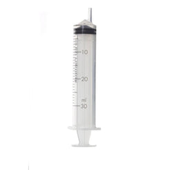 Syringe, sterile, disposable, two piece, polypropylene (PP) 30ml capacity, latex free, sterilised by ethylene oxide (EO) CE 0318 marked, natural (clear) polypropylene (PP) barrel with black print graduated scale in 1ml divisions White (opaque) polyethylene (PE) piston / plunger, with retaining ring to prevent accidental piston / plunger rod withdrawl Luer slip nozzle, eccentric tip, without needle, natural, translucent, individually wrapped in blister film and medical grade paper Becton Dickinson, BD Plastipak, 30ml Luer